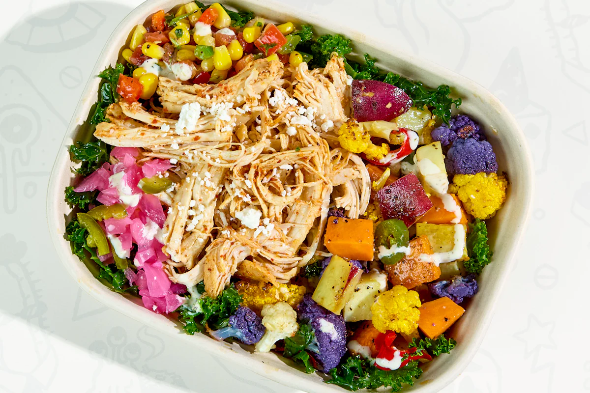 ALL NEW! Packed with spicy sheet pan veggies, then topped with your choice of roasted chicken or double sheet pan veggies, kale, pickled red onions, pickled jalapeños, queso fresco, corn salsa, and avocado ranch sauce.